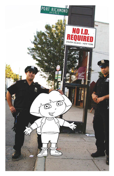 When creating Dora, Morales wanted to demonstrate the unfairness of Arizona's anti-Latino law (SB 1070), which expands statewide police-powers to stop, question, and detain anyone who looks slightly Hispanic, instantly demanding that they produce papers, in order to prove that they are allowed to be in the USA. Even natural-born "Hispanic-looking" citizen are subject to this unfair treatment. Morales plays with the idea, suggesting in his work that even little, cute, lovable and adorable Dora could be unduly targeted within a rapidly emerging 21st Century North-American totalitarian state: ARIZONA!!